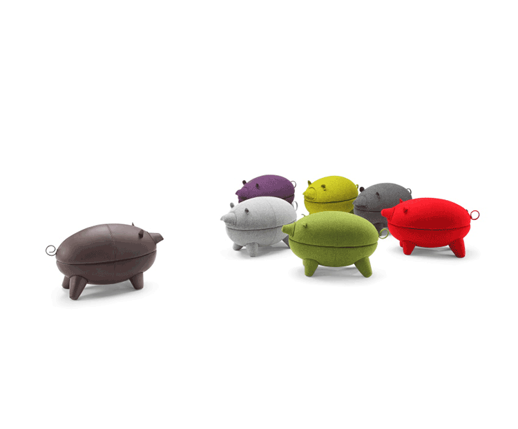 猪圆凳与现实中的动物“小猪”十分形似,设计灵感亦来源于此。基于猪圆凳简约的设计线条,其外表可做成油漆、皮革或布,颜色搭配更为丰富多彩,方便搭配各种场景和范围。猪圆凳同时还是一张多功能的圆凳,取去猪的上半部分,可作为茶几使用,其材质为玻璃钢,下隔层可以放置小物件和杂志等。