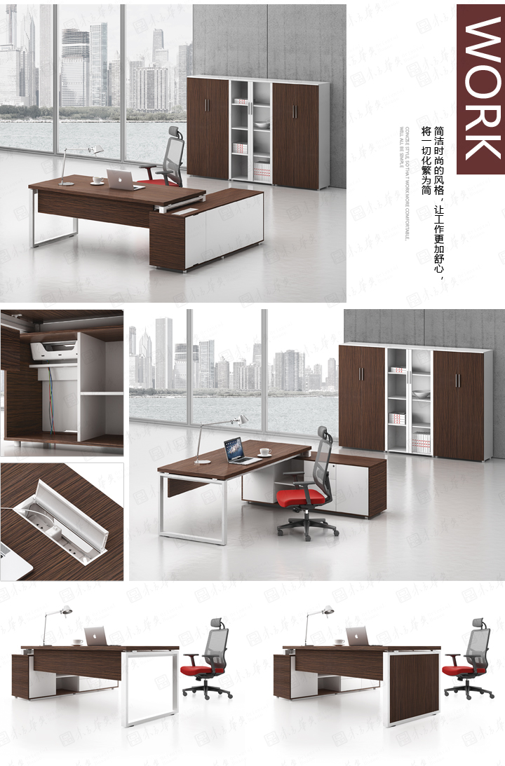 凯撒系列,源自德国的设计风格,糅合木的柔美与刚强的特质,深褐色的睿智理性与白色的纯净空白带来强烈的视觉对比。桌脚部位采用白漆方框金属支撑架,或是装饰或是必须,恰到好处地表现凯撒的艺术姿态。如此,简练高雅的设计,体现出东方华奥现代办公打造的高品位、个性化的办公方式。